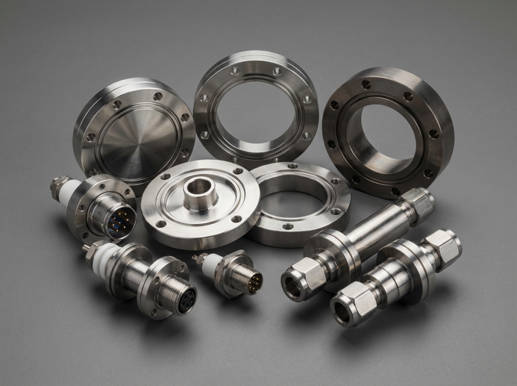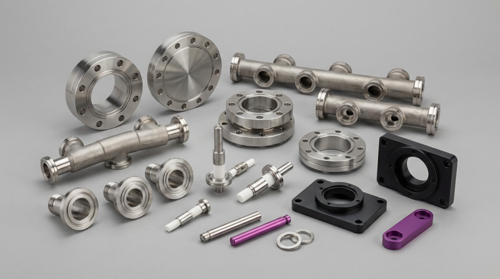 We machine metals, engineered plastics, and ceramics chosen for low outgassing, thermal stability, and corrosion resistance. Finishes are specified for conductivity, cleanliness, and tight Ra requirements.