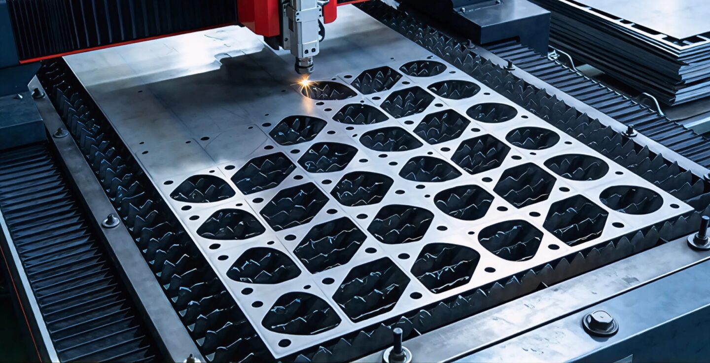 Laser cutting for complex profiles, CNC punching for batch holes, and shearing for straight cuts.