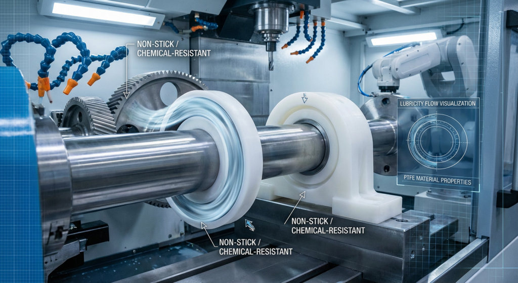 Teflon (PTFE) – Superior lubricity and chemical resistance; limited machinability