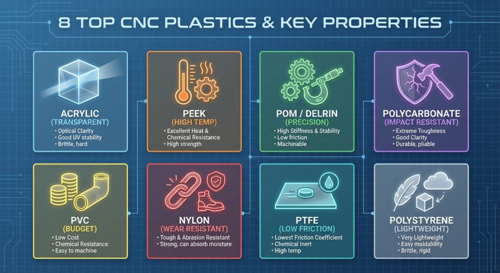 Acrylic (PMMA) – Best for clarity and optical applications; excellent machinability