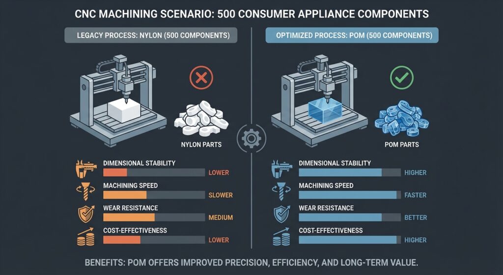 We recommended POM (Delrin) instead of the nylon they'd been considering. While nylon was cheaper per pound (18), here's why POM made sense: